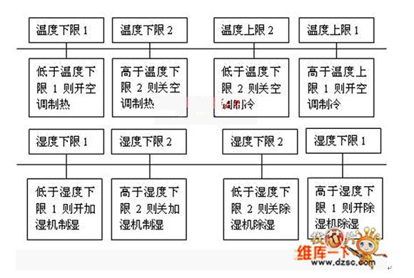 上電初始化,根據(jù)板子的撥碼開(kāi)關(guān)的狀態(tài)讀取并保存溫濕度儀地址;讀取存在外存中的上次已設(shè)置好的溫濕度上下限的歷史值和保存的采樣間隔歷史值。然后,進(jìn)入主循環(huán)中,根據(jù)采樣間隔時(shí)間,將溫度、濕度、等數(shù)據(jù)存入外存,點(diǎn)亮LED數(shù)碼管顯示當(dāng)前時(shí)間、溫度、濕度,并根據(jù)已設(shè)置好的溫濕度上下限值來(lái)確定是否驅(qū)動(dòng)蜂鳴器報(bào)警且控制空調(diào)機(jī)、加濕機(jī)、除濕機(jī)工作進(jìn)行溫濕度控制調(diào)節(jié)[7](溫濕度上下限控制示意圖見(jiàn)圖3)。系統(tǒng)有良好的交互性能,利用中斷可在線隨時(shí)設(shè)置時(shí)間校正值、溫濕度上下限值、采樣間隔時(shí)間值、溫濕度校正值并將這些數(shù)據(jù)存到外存中;可在線提取當(dāng)前溫濕度數(shù)據(jù)和溫濕度儀狀態(tài)等數(shù)據(jù);可由相應(yīng)指令提取根據(jù)采樣間隔已存在外存中的歷史溫濕度數(shù)據(jù)。