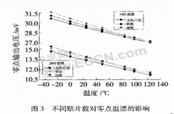 從圖3可以看出,貼片膠對傳感器零點的影響隨溫度變化而變化,在低溫時,使用了硬膠貼片的傳感器的零點明顯高于使用軟膠與無膠的,這種差別隨著溫度的升高變得越來越小。這主要有三個原因:①貼片膠的彈性模量隨溫度的升高而變小;②貼片膠高溫固化,在低溫時會引起收縮殘余應力;③貼片膠和芯片材料熱膨脹系數不同產生的熱應力。特別需要注意的是,在85℃之后,硬膠的影響突然變小,小到幾乎與無膠的情況相同。這是因為硬膠的玻璃化溫度(Tg)為85℃,高于Tg點時膠的楊氏模量變小,因而對傳感器的零點溫漂影響變小。因此,在選用貼片膠時,要求膠的Tg大于傳感器的工作溫度,以確保傳感器零點的穩定性和工作的可靠性。
