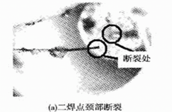 用于引線鍵合的鍵合線有Al線和Au線,由于Au線性能更優,所以壓力傳感器的鍵合工藝選用Au線。鍵合時要使鍵合面保持清沽,否則會影響鍵合強度,等離子清洗是一種能有效提高鍵合強度的方法。由于機油壓力傳感器工作環境惡劣,尤其是頻繁的振動會導致金絲有缺陷的地方疲勞斷裂,或者最容易疲勞的位置如第二焊點附近的頸部位置發生斷裂,因此要求更高的鍵合質量。曾對所研制的機油壓力傳感器進行了臺架試驗,在一批試驗樣品中經過6×105次加壓和卸壓試驗之后,發現有兩個樣品失效,故障分析結果表明:一個樣品的失效模式為信號處理電路上的一個電阻損壞;另一個樣品的失效模式為金絲線斷裂,如圖4(a),(b)所示。對于這種情況,可以采用雙金絲鍵合工藝,并盡量選用高純度、低缺陷的金絲,并做好引線鍵合前各封裝器件的清潔工作,如圖4(c)所示。這樣對金絲鍵合工藝進行改進后,在可靠性試驗中,未曾出現金絲斷裂的質量問題。