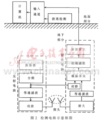 整個系統(tǒng)分為地上和地下兩部分,其基本組成結(jié)構(gòu)如圖2所示。兩大部分之間通過電纜相連接。地下部分中包括裝有線圈的探頭以及分別屏蔽在兩個金屬盒中的發(fā)射電路和接收電路。地下部分的所有裝置全部固定安裝在一節(jié)經(jīng)過防水處理的直徑為8cm左右的聚氯乙稀管內(nèi)。為了防止對探頭檢測過程的干擾,設(shè)計(jì)時應(yīng)該充分考慮地下部分的電路及導(dǎo)線的固定和屏蔽問題。
