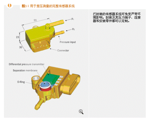 如果將壓力變送器用作獨立測量系統,必須保護其免受外部環境影響,如在其結合處附件的灰塵和水霧。這一點是通過使用在大多數應用中都具有良好的媒介抵抗性和充分的溫度穩定性的塑料封裝實現的。該封裝及其壓力端子、連接器和安裝零件都適合客戶定制(圖3)。對于要求極高的應用,還可以提供不銹鋼封裝版本。應用包括測量差壓、監測腐蝕性氣體濾波器和測量冷卻劑壓力。