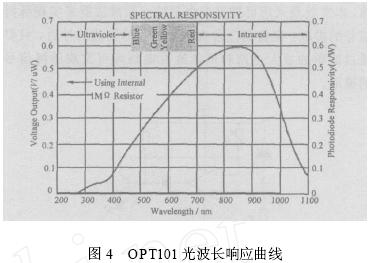 在本文中, 采用一種新型的光敏元件OPT101 , 該元件將感光部件和放大器集成在同一個芯片內部, 這種集成化的設計方式有效地克服了后端運算放大器空載電流輸出對光敏部件輸出電流的影響, 而且芯片輸出的電壓信號可以通過外部的精密電阻進行調節, 有利于芯片適應整體的電路設計, 同時芯片的集成化設計也能夠減小系統的功耗。