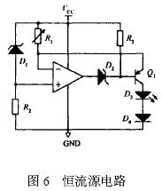 圖6 為恒流源電路, 在電路中R1 兩端的電壓值恒等于穩壓二極管D1 的穩壓值,因此流經R1 的電流值恒定,控制使三極管Q1 處于放大狀態, 那么流過發光二極管D3 的電流值恒定,因此發光二極管D3 能輸出穩定光強的光。[page]