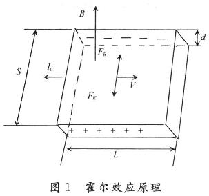 如圖1所示,一個N型半導體薄片,長度為L,寬度為S,厚度為d,在垂直于該半導體薄片平面的方向上,施加磁感應強度為B的磁場,若在長度方向通以電流Ic則運動電荷受到洛倫茲力的作用,正負電荷將分別沿垂直于磁場和電流的方向向導體兩端移動,并聚集在導體兩端形成一個穩定的電動勢UH,這就是霍爾電動勢(或稱之為霍爾電壓),這種現象稱為霍爾效應。霍爾電壓的大小UH=RIB/d=KHICB,其中R為霍爾常數;KH為霍爾元件的乘積靈敏度。