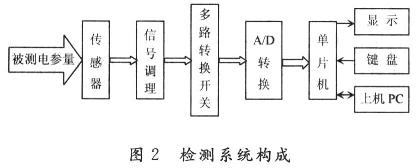 檢測系統構成如圖2,被測量經霍爾傳感器轉換為電壓信號,經信號調理電路和多路轉換開關選擇,通過A/D轉換器送給單片機,單片機采用89C51,是該系統的主控器,鍵盤選用2×4鍵盤,用于選擇被測量的種類,采用數碼管或液晶顯示被測量的大小。