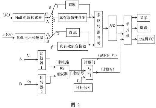 由正弦交流電有功功率的定義P=UIcosψ可知,只要準確測量出U,I及電流與電壓相位差ψ,就可算出P與cosψ。采用傳統的電磁式電壓、電流互感器進行測量,由于互感器的非理想性,除存在變比誤差外,更主要的是存在較大的相位誤差,這就使測得的ψ值不能真實地反映負載的性質。若采用霍爾電壓、電流傳感器及真有效值轉換器(如AD637)等,可以使功率及功率因數的測量精度大大提高。