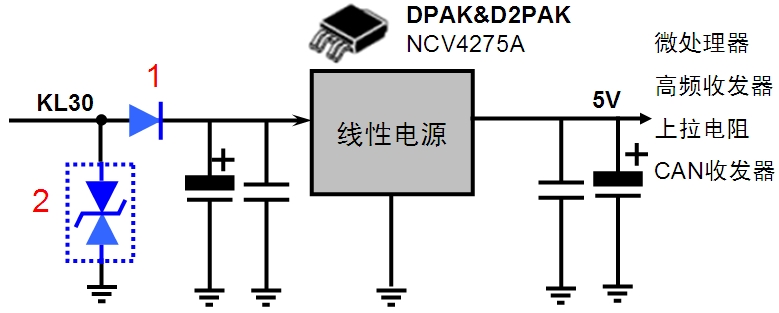 NCV4275A是一款帶復(fù)位和延遲功能的5 V、3.3 V/450 mA低壓降(LDO)線性穩(wěn)壓器,這款器件支持可編程微控制器復(fù)位,并提供多種特性,如過流保護、過溫保護、短路保護等。此外,在下圖中位置1處串聯(lián)一個二極管(MRA4005),這線性電源能有效防止高達-42 V的反向電壓。
