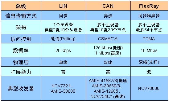 可以應(yīng)用于汽車中的系統(tǒng)總線有多種,如控制器區(qū)域網(wǎng)絡(luò)(CAN)、本地互連網(wǎng)絡(luò)(LIN)及FelxRay等。這些總線的特點各不相同,表1比較了汽車應(yīng)用中幾種常見的系統(tǒng)總線,并列出了典型的安森美半導(dǎo)體總線收發(fā)器產(chǎn)品。