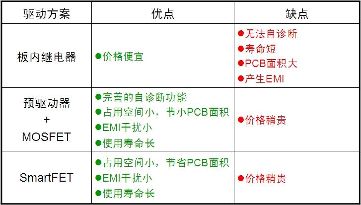 第三種方案是采用SmartFET驅(qū)動。這是帶保護的MOSFET,在MOSFET基礎(chǔ)上增加了多種功能,如過壓鉗位、ESD保護、過流保護、過溫保護、反壓保護及高邊和低邊驅(qū)動。典型器件如低邊驅(qū)動的NCV8401/2/3,及用于高邊驅(qū)動(內(nèi)部集成了升壓電路)的NCV8450和NCV8460等。這三種方案的優(yōu)缺點見表2。
