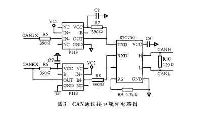 CAN通訊網(wǎng)絡(luò)模塊負(fù)責(zé)將啟動(dòng)信號(hào)和檢測(cè)信號(hào)通過(guò)CAN網(wǎng)傳輸給汽車的中央處理器。中央處理器通過(guò)接收的信號(hào)做決策判斷。CAN總線通信方式靈活、抗干擾能力強(qiáng),目前在汽車控制系統(tǒng)中應(yīng)用廣泛。CAN通訊接口硬件設(shè)計(jì)如圖3所示,其中82C250是CAN控制器和物理總線間的接口,它和CAN控制器之間采用光隔P113來(lái)提高系統(tǒng)的抗干擾能力。