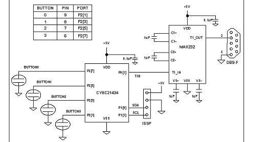 為實(shí)現(xiàn)電容式傳感和串行通信,電路設(shè)計(jì)中采用了賽普拉斯公司的CY8C21x34系列的PSoC芯片,其中包含了一組模擬和數(shù)字功能模塊,它們由存儲(chǔ)在板載閃存中的固件來設(shè)置。第二個(gè)芯片處理RS232電平移位,以提供與一臺(tái)主機(jī)的通信鏈路,使電容式傳感數(shù)據(jù)記錄通過串口以115200波特率傳輸給主機(jī)。四個(gè)電容傳感按鍵的引腳分配顯示在圖5中的表中。通過ISSP接口和編程引腳SCL、SDA對(duì)PSoC進(jìn)行編程。ISSP接口中包含電源和地,而PC主機(jī)連接到電容式傳感電路板通過標(biāo)準(zhǔn)的DB9連接器。