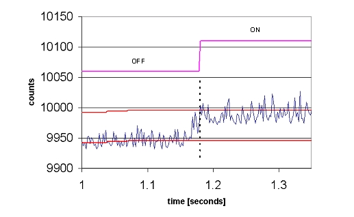 通過一個(gè)終端仿真程序,在主PC上獲得差分計(jì)數(shù),然后借助電子制表軟件加以繪制。將手指放置在10mm厚的玻璃覆蓋層上,并持續(xù)3秒的時(shí)間。按鍵的開關(guān)狀態(tài)被疊加在原始計(jì)數(shù)上。按鍵在這兩種狀態(tài)之間干凈利落地轉(zhuǎn)換,即使是由于通過厚玻璃進(jìn)行檢測(cè)而使原始計(jì)數(shù)信號(hào)中具有較大的噪聲時(shí)也是如此。請(qǐng)注意手指和按鍵門限隨著基線的漂移而進(jìn)行周期性調(diào)整。當(dāng)檢測(cè)到手指的觸壓動(dòng)作時(shí),基線值將鎖定,直到手指移開為止。