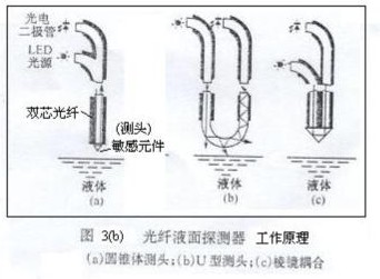 光纖液位傳感器的工作原理如圖3(b)所示。發光器件射出來的光通過傳輸光纖送到敏感元件,在敏感元件的球面上,有一部分透過,而其余的光被反射回來。當敏感元件與液體相接觸時,與空氣接觸相比,球面部的光透射量增大,而反射量減少。因此,由反射光量即可知道敏感元件是否接觸液體。反射光量決定于敏感元件玻璃的折射率和被測定物質的折射率。被測物質的折射率越大,反射光量越小。來自敏感元件的反射光,通過傳輸光纖由受光器件的光電晶體管進行光電轉換后輸出。敏感元件的反射光量的變化,若以空氣的光量為基準,在水中則為-6--7dB,在油中為-25-30dB。可對反射光量差別很大的水和油等進行物質判別。