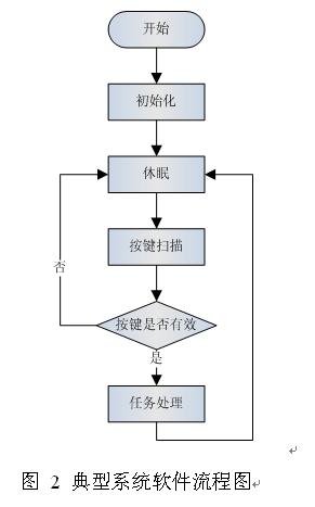 圖2是一個(gè)具有休眠功能的典型系統(tǒng)軟件流程圖。系統(tǒng)初始化后進(jìn)入休眠模式,經(jīng)過一段時(shí)間的延時(shí)后喚醒掃描按鍵模塊,進(jìn)行按鍵掃描。如果有按鍵按下,軟件判斷是否有效。如果無效按鍵按下,那么系統(tǒng)繼續(xù)進(jìn)入休眠模式。如果軟件判斷按鍵有效,那么喚醒系統(tǒng),觸發(fā)任務(wù)處理進(jìn)程。當(dāng)處理完所有任務(wù)后,系統(tǒng)又重新進(jìn)入休眠狀態(tài)。這是個(gè)典型的具有休眠功能的系統(tǒng)工作流程圖,它的優(yōu)點(diǎn)就是此軟件流程簡單易懂、容易實(shí)現(xiàn),一般可以滿足大多數(shù)場合的應(yīng)用。但是,如果系統(tǒng)任務(wù)處理消耗了較多的CPU處理時(shí)間,那么為了達(dá)到目標(biāo)平均工作電流,就需要相應(yīng)增加休眠時(shí)間。同時(shí)降低了按鍵掃描的頻率,從而加長了系統(tǒng)喚醒的響應(yīng)時(shí)間。因此,此方法適合比較簡單的、系統(tǒng)任務(wù)不復(fù)雜的應(yīng)用。