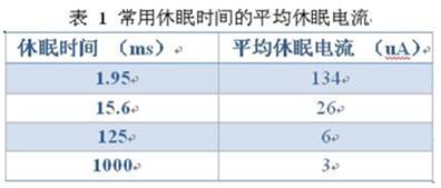 CY8C22x45系列芯片休眠時(shí)的工作電流僅有3uA[5],芯片內(nèi)包含一個(gè)休眠計(jì)數(shù)器,系統(tǒng)進(jìn)入休眠后計(jì)數(shù)器開始遞減,當(dāng)計(jì)數(shù)值為零時(shí)產(chǎn)生中斷喚醒系統(tǒng)。喚醒系統(tǒng)后可以不做任何處理再次進(jìn)入休眠模式。這樣周而復(fù)始,達(dá)到所需要的整個(gè)休眠時(shí)間。在實(shí)際設(shè)計(jì)中,常常使用平均休眠電流替代公式2中的Isleep,即在每次休眠結(jié)束后,僅讓系統(tǒng)正常工作最短時(shí)間,該時(shí)間內(nèi)完成所有必須操作(僅是一次循環(huán)判斷),此時(shí)的電流即為該休眠時(shí)間下的平均休眠電流。表1列出了常用休眠時(shí)間的平均休眠電流。