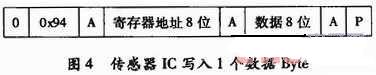 寫數據格式:圖4所示為向傳感器IC寫入1個字節數據時的正確幀格式。