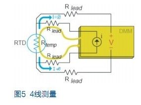 與熱敏電阻相似,鉑電阻溫度傳感器(RTD)也是用鉑制成的熱敏感電阻。當通過測量電壓計算RTD 溫度時,數(shù)字萬用表用已知電流源測量該電流源所產(chǎn)生的電壓。這一電壓為兩條引線(Vlead)上的壓降加RTD上的電壓(Vtemp)。例如,常用RTD 的電阻為100Ω,每1℃僅產(chǎn)生0.385Ω的電阻變化。如果每條引線有10Ω電阻,就將造成26℃的測量誤差,這是不可接受的。所以應對RTD作4線歐姆測量。