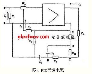 輸出的電流經過運算放大及驅動環節得到所需的補償電流磁勢I2eWe,運算放大環節在自動控制系統中屬于比例控制。比例控制的最大缺點是存在余差,當對控制質量有更高要求時,就需要在比例控制基礎上,再加上能消除余差的積分控制作用。微分控制系統中即使偏差很小,只要出現變化趨勢,就可馬上進行控制,有超前控制的特點,因此本文在差值電流補償回路中采用PID控制器。PID反饋電路如圖4所示,它既能快速進行控制,又能消除余差,具有較好的控制性能。比例積分微分控制規律為: