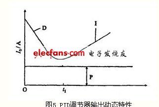 PID運算電路的工作過程如下:當輸入信號Ii有一階躍變化時,一開始CD、C1,相當于短路,輸入信號突跳至微分作用最大值。繼而隨著對CD的充電,負反饋電壓逐漸升高,輸出電流I0逐漸衰減下來。與此同時,CI也被充電,隨著CI兩端電壓逐漸增加,負反饋作用逐漸減小,輸出電流I0又慢慢上升。在Ii階躍作用下,PID輸出特性曲線見圖5。