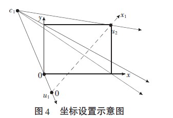 假設(shè)虛擬觸摸屏是如圖4所示的矩形區(qū)域,以左下角為原點(diǎn),建立二維坐標(biāo)平面x、y。左邊攝像頭c1位于虛擬觸摸屏左上角某處,其視角范圍應(yīng)包含整個(gè)矩陣區(qū)域,將c1與矩形的4個(gè)頂點(diǎn)連接構(gòu)成攝像頭拍攝各點(diǎn)的光線方向,以經(jīng)過(guò)左下角和右上角頂點(diǎn)的光線方向?yàn)檠琧1為頂點(diǎn)作一個(gè)等腰三角形,底為虛線所示的(u1,u2)。當(dāng)手指在矩形區(qū)域內(nèi)任意一點(diǎn)觸摸時(shí),其在攝像頭所拍攝的圖像中均表現(xiàn)為虛線上的一點(diǎn),手指在二維虛擬觸摸屏上的移動(dòng)投影到圖像上不會(huì)超過(guò)這條虛線(u1,u2)范圍,這是算法關(guān)注的興趣區(qū)域,區(qū)域以外的部分不需要處理。因此以u(píng)1為原點(diǎn)沿著虛線方向建立一維坐標(biāo)x1,右邊攝像頭拍攝圖像中的一維坐標(biāo)x2類似設(shè)立。