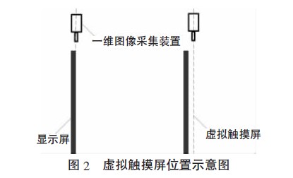設(shè)計(jì)了一種虛擬觸摸屏系統(tǒng),其特色在于由圖像采集裝置獲取的一維圖像數(shù)據(jù)來(lái)確立用戶手指觸摸二維虛擬觸摸屏上的位置坐標(biāo)。前提是一維圖像采集裝置的安裝位置,它從根本上解決了大屏幕觸摸屏中人體遮擋手指無(wú)法識(shí)別的問(wèn)題,且其進(jìn)行的是一維數(shù)據(jù)的處理,相比于二維圖像處理算法更加簡(jiǎn)單。