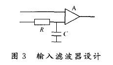 對于高精度mV 級(jí)的DC放大器,其各種交流干擾都將成為放大器寄生信號(hào)的重要信號(hào)源,因此,必須在運(yùn)算放大器的輸入端加輸入濾波器,通常由一個(gè)大電阻(4.7 kΩ)和一個(gè)小電容(3.3μF)構(gòu)成RC濾波,如圖3所示。