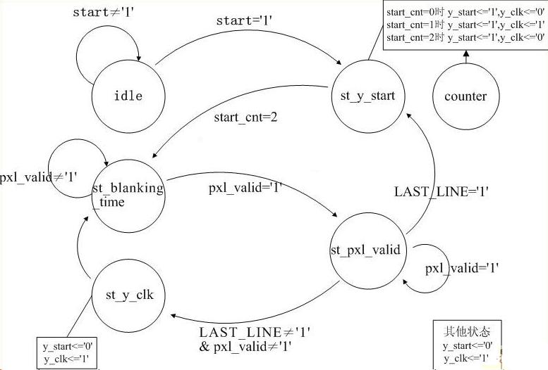 CMOS圖像傳感器結(jié)構(gòu)簡單,內(nèi)部集成度高,因此僅需很少的外部控制信號即可完成視頻圖像的采集輸出。系統(tǒng)工作過程如下:當(dāng)系統(tǒng)上電后,CPLD產(chǎn)生復(fù)位信號復(fù)位整個芯片到初始狀態(tài),然后對芯片進(jìn)行并行數(shù)據(jù)注入,向CMOS圖像傳感器的特殊寄存器寫入預(yù)定值,設(shè)置諸如像元積分時間,像素讀出行數(shù),輸出放大器增益等參數(shù)。隨后CPLD給CMOS芯片提供 ss_start信號,標(biāo)志開始像素積分,ss_stop信號結(jié)束像素積分,隨后圖像傳感器即處于可讀出狀態(tài)。向CMOS發(fā)出y_start信號開始一幀圖像的讀出,發(fā)出y_clock信號,開始一行圖像的讀出,當(dāng)CMOS圖像傳感器有像素信號輸出時, pxl_valid引腳信號為高,此時CMOS圖像傳感器正在進(jìn)行一行圖像的輸出,當(dāng)pxl_valid變低時,一行圖像輸出結(jié)束,CPLD再提供下一個y_clock信號,啟動CMOS進(jìn)行下一行圖像的讀出。當(dāng)一幀圖像的最后一行開始讀出時,CMOS芯片的LAST_LINE引腳變高,標(biāo)志一幀圖像讀出的結(jié)束,CPLD再產(chǎn)生下一個ss_start信號,開始下一幀圖像的讀出。這樣,CMOS就在CPLD的時序控制下,正常工作,循環(huán)讀出圖像。
