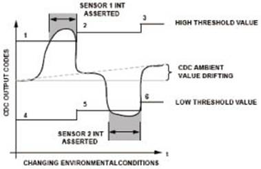 隨著環(huán)境條件的變化(例如,溫度或濕度上升),傳感器的環(huán)境參數(shù)(在用戶沒有與傳感器接觸期間,由CDC進(jìn)行測(cè)量)會(huì)發(fā)生漂移。為了進(jìn)行補(bǔ)償,需要?jiǎng)討B(tài)改變高端和低端閾值電平,以確定有效的傳感器接觸。位置2、3、5、6處的參考電平進(jìn)行重新調(diào)整,以保持最佳的閾值參考電平,從而自動(dòng)跟蹤和補(bǔ)償漂移誤差。
