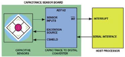 電容觸摸傳感器接口通常由一個(gè)電容傳感器、一個(gè)電容數(shù)字轉(zhuǎn)換器(CDC)和一個(gè)主處理器組成(圖1)。傳感器利用標(biāo)準(zhǔn)兩層或四層PCB上的走線(trace)或柔性電路制造,因此不需要任何外部元件或材料。