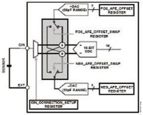 PCB還可能受到寄生電容的影響,這種電容最大可達(dá)20 pF,它會(huì)在電容觸摸傳感器視為受到按壓時(shí),使閾值發(fā)生偏移,從而改變其靈敏度。為了對(duì)寄生電容進(jìn)行補(bǔ)償,可以采用對(duì)DAC編程的方法,以抵消CDC的輸入。對(duì)于各PCB來說,這種寄生電容是一致的,因此可以在制造PCB的時(shí)候進(jìn)行簡(jiǎn)單的調(diào)整,這樣就不需要外部RC調(diào)諧元件,從而使材料、裝配和測(cè)試相關(guān)的成本最低。單獨(dú)調(diào)整每個(gè)傳感器的偏移,使設(shè)計(jì)者可以充分利用轉(zhuǎn)換器的分辨率(圖3)。