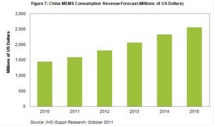 未來幾年,中國市場上增長最快的MEMS領(lǐng)域?qū)⑹鞘謾C(jī)與消費(fèi)市場的麥克風(fēng)、加速計(jì)和陀螺儀。IHS公司預(yù)計(jì),2015年該市場的MEMS銷售額將達(dá)到13億美元,2011-2015年復(fù)合年度增長率為21%。