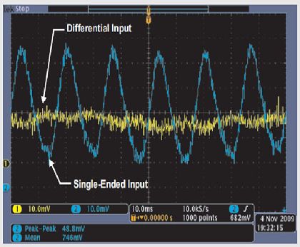 2、電荷放大器是一種非常敏感(高增益)的電路。圖17表明任何輸入干擾信號的電容耦合(此處為60Hz極板網柵)都會有效注入電流。就單端放大器而言,這意味著端子中的一個注入電流,而其他則接地;也就是說,放大器只會放大干擾信號。就差分輸入來說,施加于兩個端子的共模信號會相互抵消(假設寄生和反饋網絡相同)。圖18中,需要注意的是單端輸入(藍色軌跡)60Hz極板網柵的耦合結果,以及60Hz共模噪聲如何被干擾信號(黃色軌跡)相互抵消的差分輸入極大降低。本例中,為了方便理解,我們并沒有嘗試匹配超出10%組件容限的差動輸入。
