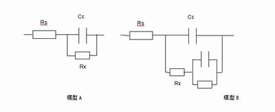 在模型A中電阻器Rs表示金屬所在的溶液,而電容Cc表示金屬表面的保護(hù)涂層或涂料,這表示初始涂層的電容。經(jīng)過一段時(shí)間后,水滲入涂層中形成新的液體和金屬界面。隨著金屬的腐蝕,通過溶液與金屬之間的保護(hù)涂層形成離子導(dǎo)電路徑。這可以用Rx與Cc并聯(lián)模型來表示。另外,有些模型(模型B)還有一個(gè)附加的R和C并聯(lián)起來再與Rx串聯(lián)的電路來表示金屬保護(hù)涂層隨著時(shí)間變化的分層模型。