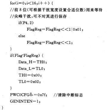 根據軟件濾波設計思想,濾波子程序由主程序在信號狀態發生變化,進入中斷時調用,圖2給出了濾波程序流程。對照圖1中4種Section來分析流程圖。當有邊沿或干擾信號(信號周期大于計數時鐘周期)到來時,VRS51L3074單片機的PWC計數停止條件滿足,系統進入中斷服務子程序。在中斷子程序中,首先重置脈寬計數條件,然后對當前狀態進行采樣,采樣1次,狀態寄存器左移1位,采樣到高電平記為“1”,采樣到低電平記為“0”。如正常下降沿Section B,前面處于高電平段,初始狀態變量Flag全為1,當出現低電平,控制器進人中斷,緊接著進行16次采樣。前已提及系統處理的尖峰干擾約1~2 ms,每個采樣周期約為0.4 ms,其尖峰干擾脈寬達不到8個采樣周期。系統設計時采樣16次,只取最后8次的存儲狀態與原狀態進行比較,如果最后采樣的狀態全為“0”則與原狀態相反,就可判斷出這是1個正常下降沿。如果是干擾信號引起計數中斷,前面8個采樣狀態不全為“1”,后面8個狀態全為“1”,最后采樣的狀態與原狀態相同,就可判斷出這是1個干擾信號,如Section A。在信號狀態采樣期間,計數條件滿足PWC繼續計數,直到真正的下降沿到來,計數停止并保存,計數寄存器還原為初始值,這樣干擾信號即被濾除。類似地,正常上升沿Section D,存儲器原狀態為“0”,上升沿來臨后存儲器狀態為“1”,與原狀態相反,PWC計數停止并保存,計數寄存器還原為初始值,退出中斷子程序。有干擾信號出現后采樣狀態與原狀態相同,干擾尖峰脈沖可被濾除。如果要使脈寬計數更精確,可判斷前8個采樣周期中系統不正常計數的周期,然后與最終計數周期相加即可。此時,程序流程體現出軟件濾波功能。