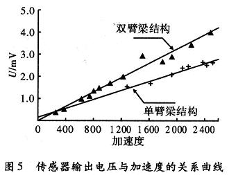 對(duì)制作的加速度傳感器樣品,在馬希特?fù)翦N上進(jìn)行了大量地沖擊標(biāo)定測(cè)試,測(cè)試結(jié)果表明:設(shè)計(jì)和加工制作的加速度計(jì)樣品在進(jìn)行加速度的沖擊時(shí),有較好的信號(hào)輸出,單臂梁結(jié)構(gòu)的加速度計(jì)的靈敏度為1 μV/gn;雙臂梁結(jié)構(gòu)的加速度計(jì)的靈敏度為1.6μV/gn,與理論設(shè)計(jì)值基本吻合。