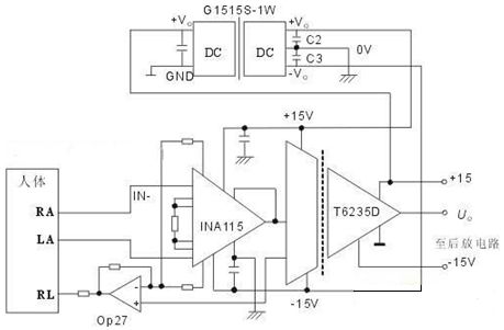 以上電路是由漢為公司的T6235D與INA 115等組成的隔離型心電檢測前置放大電路,該電路由于其具有輸入阻抗高、漏電流小、檢測精度高和滿足人體安全等指標完全可以達到醫療器械使用的要求標準。該電路一般作為前置放大電路,器件直接與人體接觸,并拾取心電信號后通過INA115進行放大,最后由ISO122隔離傳輸到后置放大電路,實現人體信號與輸出及電源的隔離放大。