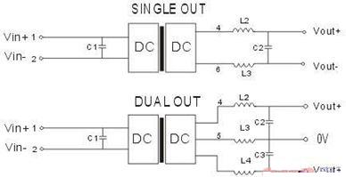 3、 由于DC/DC電源模塊是采用開關振蕩電路來實現的,其自身也會產生共模、差模噪聲的干擾,對于對紋波噪聲要求較高的場合可在DC/DC電源模塊的輸出端外接無源LC濾波網絡或RC(損耗較大),以進一步降低電源紋波噪聲,但是要注意L自身諧振頻率要遠高于模塊的開關頻率,允許通過的電流值最好在模塊輸入電流的兩倍以上,內阻要小,以降低直流損耗。具體可參考下圖:
