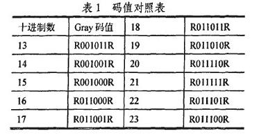 編碼采用格雷碼(Gray)為數(shù)值碼,以某一固定碼寬為參考碼R,它用于標(biāo)尺定位和提高精度。Gray碼是一種絕對(duì)編碼方式的無(wú)權(quán)碼,它所具有的循環(huán)、單步特性能消除隨機(jī)取數(shù)時(shí)出現(xiàn)重大誤差的可能,其任意兩個(gè)柏鄰整數(shù)之間轉(zhuǎn)換時(shí),只有一個(gè)位數(shù)發(fā)生變化,大大減少了由一個(gè)狀態(tài)轉(zhuǎn)到下一個(gè)狀態(tài)時(shí)的邏輯混淆,具有較強(qiáng)的容錯(cuò)能力。以6位編碼為例,其部分十進(jìn)制數(shù)與Gray碼的一一對(duì)應(yīng)關(guān)系如表1所示。