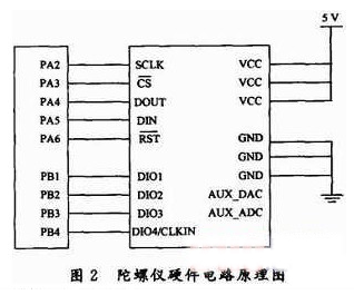 陀螺儀硬件電路原理圖如圖2所示,選用LM3S8962自帶的SPI硬件接口對(duì)ADIS16365進(jìn)行操作,在電路設(shè)計(jì)中只需要直接將LM3S8962的SPI硬件I/O接口與ADIS16365相應(yīng)的接口連接起來。