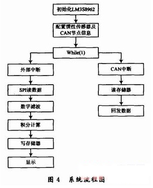 微控制器直接控制慣性傳感器的工作狀態(tài)并采集角速度、角加速度等信息,為了達(dá)到處理的實(shí)時(shí)性,當(dāng)ADIS16365有數(shù)據(jù)需要發(fā)送時(shí),中斷通知微控制器進(jìn)行讀取。微控制器將采集到的數(shù)據(jù)進(jìn)行積分及濾波處理,并將處理后的信息存儲(chǔ)在片內(nèi)FLASH中。當(dāng)微控制器接收到數(shù)據(jù)請(qǐng)求時(shí),通過CAN總線發(fā)送數(shù)據(jù)。圖4為系統(tǒng)主流程圖?! ?/p>