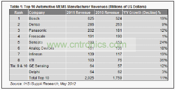 去年10大廠商合計占有91%的市場份額。2011年整體汽車MEMS傳感器營業收入為22.4億美元,比2010年的19.6億美元增長14%。盡管去年日本和泰國發生自然災害,但該產業仍然實現增長,而且未來兩年的增長將得到政府相關命令的有力推動,比如美國和歐洲國家政府要求采用電子穩定控制(ESC)和輪胎壓力監測系統。