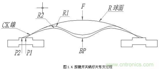 彈片自由狀態時,支撐點為P1,當外力“F”開始向下施力時,彈片開始變形及位移,此時開始產生曲線。在以P1為支撐點時,外力“F”造成彈片變形,會產生最小的R1,此時的外力“F”即為彈片的OF值。過了彈片OF值位置時,支撐點P1會開始向P2位移,只要P1一位移,則R1又會變大,造成OF值變小,此時曲線即產生向下曲線(CK)。當達到P2時,即為P2支撐之最大R2,此時即達到彈片的BP點(最小OD點)。若此時外力“F”繼續施力,則曲線又會向上產生曲線,上述過程如圖1.4所示。