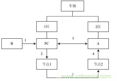 系統(tǒng)設(shè)計(jì)方案非常簡(jiǎn)單。一般來講火車車廂全長(zhǎng)26.6 m ,而無線傳感器網(wǎng)絡(luò)(wireless sensor net2works ,WSN)的通信距離在幾十米到幾百米之間,一般為30 m ,因此一個(gè)節(jié)點(diǎn)就可以完全覆蓋整個(gè)車廂。在系統(tǒng)中只有2個(gè)節(jié)點(diǎn)(不需PC協(xié)助) :節(jié)點(diǎn)1作為發(fā)信者,節(jié)點(diǎn)2作為收信者,組成最簡(jiǎn)單的網(wǎng)絡(luò),不需跳轉(zhuǎn)。系統(tǒng)的結(jié)構(gòu)簡(jiǎn)單,使得傳輸時(shí)延非常小,比較適合應(yīng)用在上文中提到的場(chǎng)合。