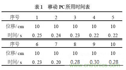現(xiàn)在通過簡(jiǎn)單實(shí)驗(yàn)獲取數(shù)據(jù)來計(jì)算人為移動(dòng)引起的az :隨意從桌上拿起筆記本,重復(fù)10次,記錄短距離10 cm)所用時(shí)間。得到10組數(shù)據(jù)如表1所示。
