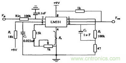 電阻Rs、R1、Rt和電容Ct直接影響轉(zhuǎn)換結(jié)果Fout,因此對元件的精度要有一定的要求,可根據(jù)轉(zhuǎn)換精度適當選擇,其中Rt、Ct、Rs、R1要選用低溫漂的穩(wěn)定元件,Cin可根據(jù)需要選擇0.1uF 或1uF 。電容C1對轉(zhuǎn)換結(jié)果雖然沒有直接的影響,但應選擇漏電流小的電容器。電阻R1和電容C1組成低通濾波器,可減少輸入電壓中的干擾脈沖,有利于提高轉(zhuǎn)換精度。電路中的47Ω 電阻對確保電路線性失真度小于0.03% 是十分必須的。