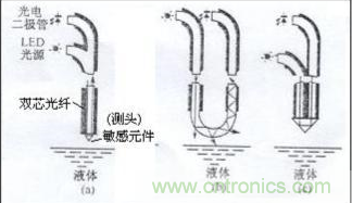 光纖液位傳感器的工作原理如圖3(b)所示。發光器件射出來的光通過傳輸光纖送到敏感元件,在敏感元件的球面上,有一部分透過,而其余的光被反射回來。當敏感元件與液體相接觸時,與空氣接觸相比,球面部的光透射量增大,而反射量減少。因此,由反射光量即可知道敏感元件是否接觸液體。反射光量決定于敏感元件玻璃的折射率和被測定物質的折射率。被測物質的折射率越大,反射光量越小。來自敏感元件的反射光,通過傳輸光纖由受光器件的光電晶體管進行光電轉換后輸出。敏感元件的反射光量的變化,若以空氣的光量為基準,在水中則為-6-—7dB,在油中為-25—30dB。可對反射光量差別很大的水和油等進行物質判別。