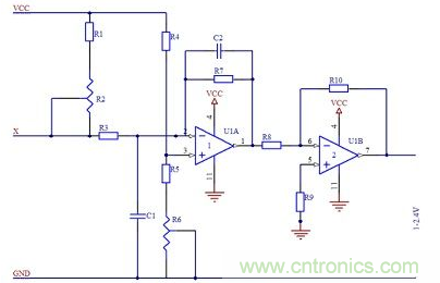 信號(hào)調(diào)理電路中還設(shè)計(jì)濾波電路,是為了濾去測(cè)量現(xiàn)場(chǎng)的干擾,例如電氣干擾、電磁干擾,使系統(tǒng)的信噪比增加。如圖2所示,電阻R2和電容C1組成簡(jiǎn)單的無(wú)源RC低通濾波器。電阻R3、R7,電容C2及運(yùn)放組成一階反相輸入RC有源低通濾波器,有源濾波器比無(wú)源濾波器具有更優(yōu)越的性能,提高了頻率特性值,改善了選擇性。