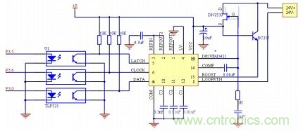 AD421是ADI公司推出的一款單片高性能數(shù)模轉(zhuǎn)換器(DAC)。它由16位數(shù)字信號(hào)以串行方式輸入,4~20 mA電流輸出,在智能儀表方面應(yīng)用廣泛。AD421與單片機(jī)的連接主要有串行數(shù)據(jù)輸入端和控制端,在時(shí)鐘CLOCK作用下,輸入移位寄存器把DATA引腳上的數(shù)據(jù)逐位讀入,LATCH鎖存脈沖把寄存器中的數(shù)據(jù)鎖存到DAC中。根據(jù)其工作原理,AD421與C8051F020芯片的接口電路如圖3所示。AD421的數(shù)據(jù)接口和單片機(jī)P3.0口相連,用來(lái)接收16位的串行數(shù)據(jù)。單片機(jī)P3.6口用來(lái)產(chǎn)生時(shí)鐘信號(hào),而P3.5口用來(lái)產(chǎn)生鎖存信號(hào)。在實(shí)際應(yīng)用中,為了保證信號(hào)的傳輸,一般要在單片機(jī)和AD421之間加入隔離器件,實(shí)現(xiàn)通訊的隔離,常用的方法有使用ADI推出的ADUM系列隔離器件,比如ADuM 1310,或者使用光耦。在這里,采用光耦來(lái)實(shí)現(xiàn)通訊的隔離。