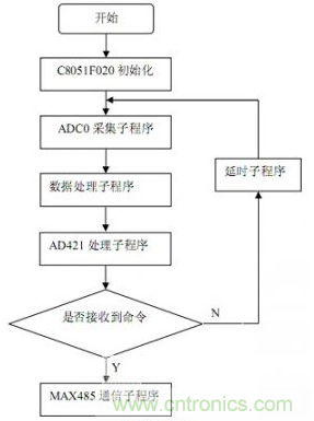 本系統(tǒng)采用C8051F020單片機(jī)為核心處理器件,把經(jīng)過(guò)調(diào)理電路處理的感應(yīng)式數(shù)字傳感器的電流信號(hào)經(jīng)模數(shù)轉(zhuǎn)換數(shù)字化,存入單片機(jī)內(nèi)部存儲(chǔ)器,并轉(zhuǎn)化為16位的數(shù)字信號(hào),一路送AD421轉(zhuǎn)化為4~20 mA標(biāo)準(zhǔn)電流信號(hào),進(jìn)行傳輸或控制;另外一路通過(guò)MAX485,在上位機(jī)查詢命令到達(dá)的時(shí)候發(fā)送上位機(jī),實(shí)現(xiàn)實(shí)時(shí)的監(jiān)控。本傳感器變送器系統(tǒng)軟件包括以下幾個(gè)部分:主程序、AD采集子程序、數(shù)據(jù)處理子程序、AD421轉(zhuǎn)化子程序、MAX485通信子程序,另外,根據(jù)需要可以加入報(bào)警子程序和其他的輔助程序等。整個(gè)系統(tǒng)如圖5所示。