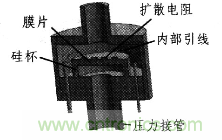 所設計的壓阻式壓力微傳感器,其制法是將N型硅腐蝕成厚10~25μm的膜片,并在一面擴散了4個阻值相等的P型電阻。硅膜片周邊用硅杯固定,則當膜片兩面有壓力差時,膜片即發生變形,從而導致電阻變化。用微電路檢測出這種電阻變化,通過計算即可得出壓力變化如圖2所示。
